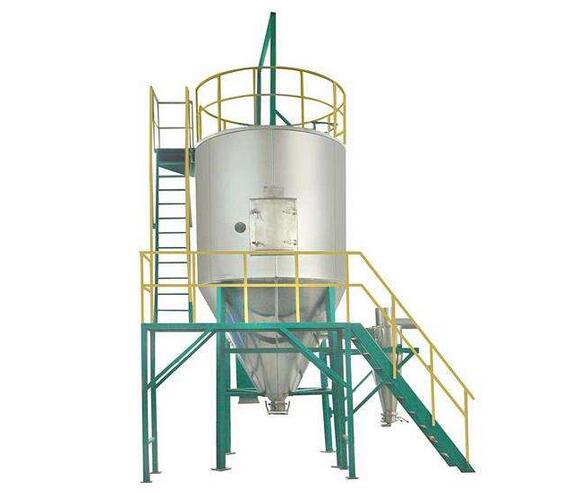 空氣經(jīng)過過濾器和加熱器,進(jìn)入干燥器頂部的空氣分配器,熱空氣呈螺旋狀平均進(jìn)入干燥。料液由料液槽經(jīng)過濾器由泵送至干燥器頂部的霧化器,使料液噴成極小的物狀液滴,料液和熱空氣并流接觸,水份疾速蒸發(fā),在極短的時(shí)間內(nèi)干燥為廢品。廢品同干燥塔底部和旋風(fēng)別離器排出,廢氣由風(fēng)機(jī)抽出排出。